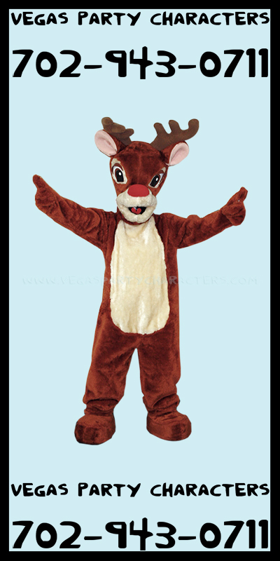 Our Reindeer mascot character is available for singing telegrams, birthday parties, corporate events, wedding appearances, and many other types of group events! If you would like to hire one of our entertainers to come out to your event in the Reindeer mascot character costume, please click here to reserve our Reindeer mascot character online or give us a call at 702-943-0711! Click on the image below to see a larger image of our Reindeer mascot character costume!